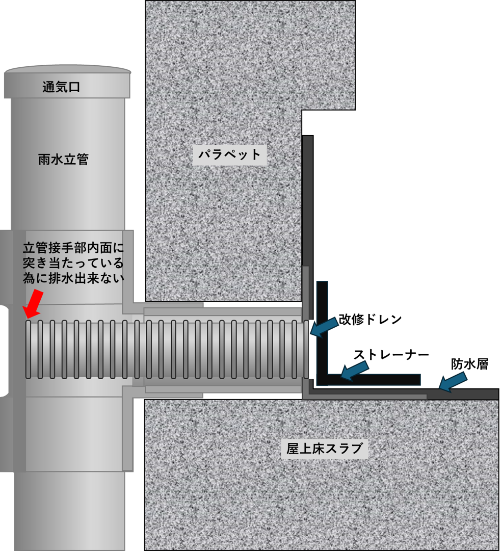 大規模修繕工事などで屋上防水を補修した場合に改修ドレンという修理部品を使用して防水層を補修しますが、施工不良により改修ドレンのジャバラホースが雨水排水管内に突き当たって排水出来ないケースです。竣工検査を十分に実施すれば防ぐことができるトラブルです。